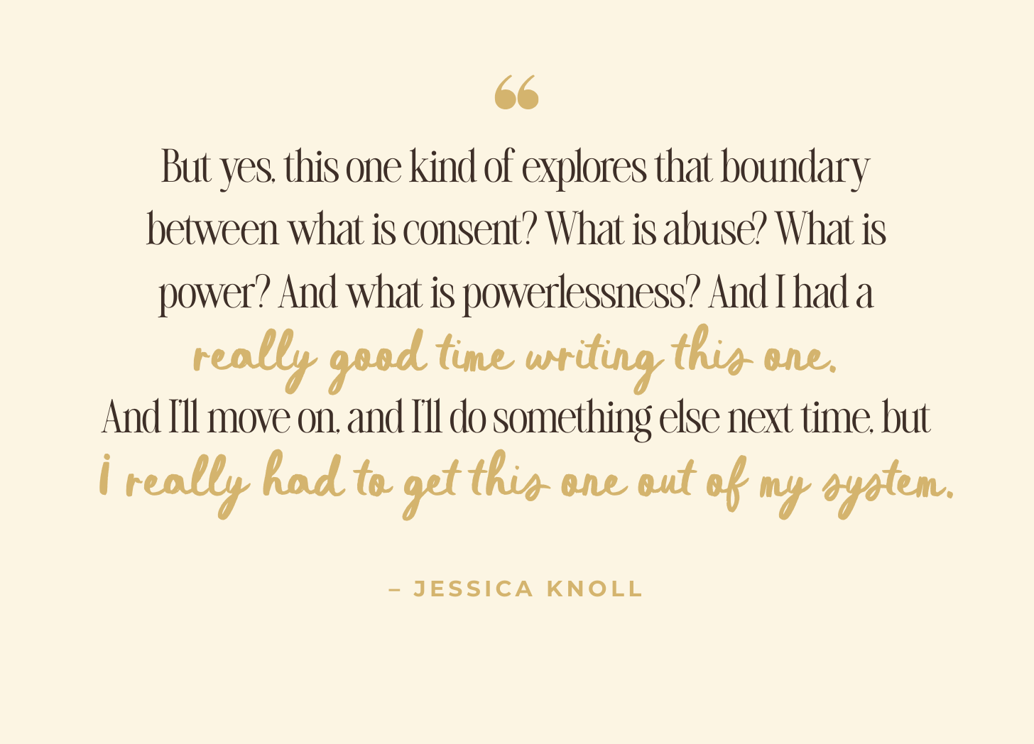 And I think that we’re seeing that everywhere. We’re seeing that with trad wives on TikTok. We’re seeing that with a BDSM version of Wuthering Heights, you know, and it’s like: Why do women fantasize about this, right? And that’s what the novel strives to answer. So you said you’ve only just started it, so I hope by the end you’ll feel that I’ve delivered my own kind of commentary on that, because that is what I set out to do. But yes, this one kind of explores that boundary between what is consent? What is abuse? What is power? And what is powerlessness? And I had a really good time writing this one. And I’ll move on, and I’ll do something else next time, but I really had to get this one out of my system.