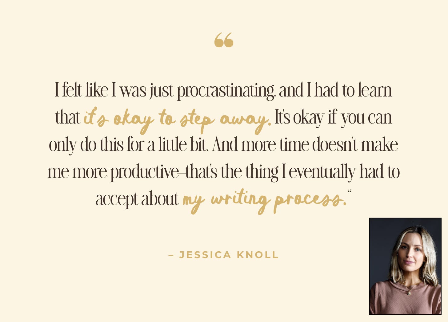 I felt like I was just procrastinating, and I had to learn that it’s okay to step away. It’s okay if you can only do this for a little bit. And more time doesn’t make me more productive—that’s the thing I eventually had to accept about my writing process.