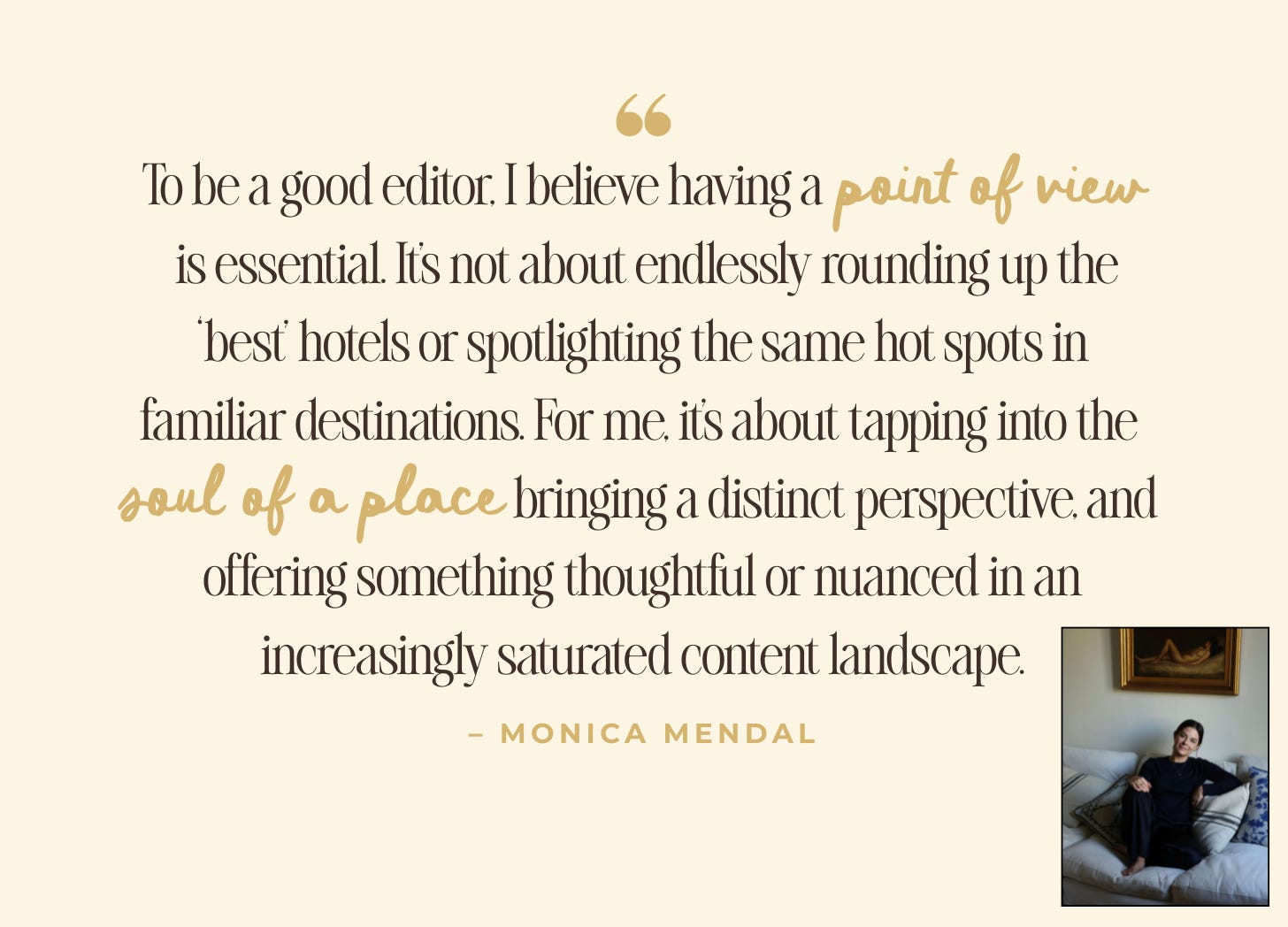 Monica Mendal: I’ve been an editor for nearly 15 years, including almost a decade as a travel editor. To be a good editor, I believe having a point of view is essential. It’s not about endlessly rounding up the “best” hotels or spotlighting the same hot spots in familiar destinations. For me, it’s about tapping into the soul of a place, bringing a distinct perspective, and offering something thoughtful or nuanced in an increasingly saturated content landscape.