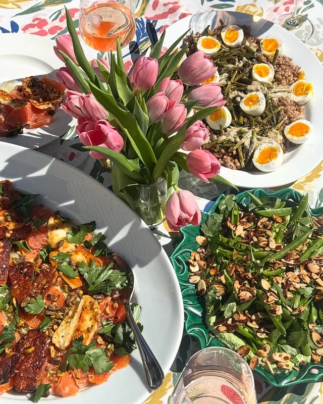 But before we get into that fun, some life catchup! Last Sunday, I spent Mother's Day weekend upstate with family in Buffalo, cooking out of ’s new cookbook, Tahini Baby. I’m a huge fan of Eden’s approach to cooking, and the spread my sister and I crafted (pictured below) of sugar snap pea crunch salad, za’atar asparagus with walnut date farro and tahini vinaigrette, and fennel salad topped with crispy halloumi was pure perfection. On Wednesday, we marked one year since my nana's passing with what we deemed the ‘nanaversary’ alongside my aunts and cousins; we all miss her dearly, so being together to cherish and share memories of her just felt right.