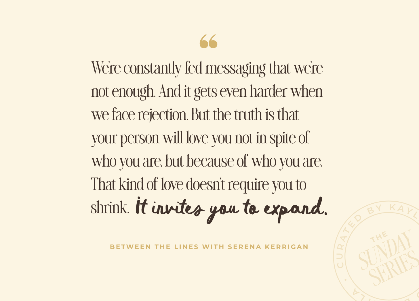 Of course, it’s hard. We’re constantly fed messaging that we’re not enough. And it gets even harder when we face rejection. But the truth is that your person will love you not in spite of who you are, but because of who you are. That kind of love doesn’t require you to shrink. It invites you to expand.