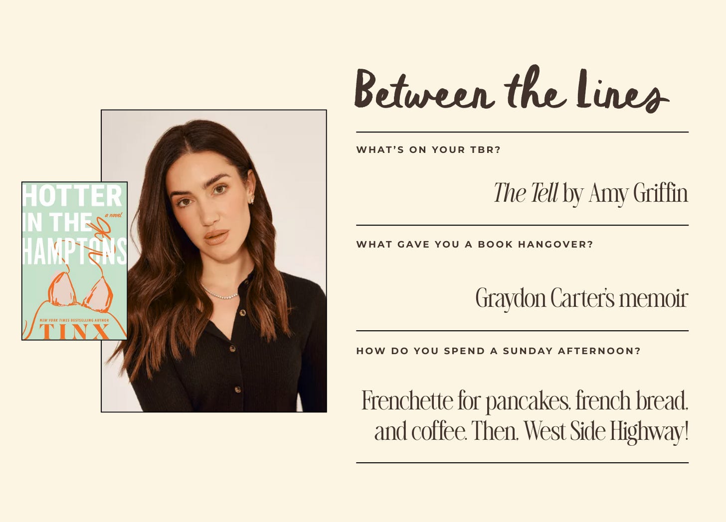 In recent years through countless editions of The Sunday Series, I’ve been able to bring you conversations on craft with writers I’ve long admired—Rebecca Serle, Robinne Lee, Carola Lovering, Grace Atwood, and more. These interviews have become some of my favorite sections of the newsletter to work on, so I decided to give them their own spotlight—and a new name to match. Introducing In Between The Lines: a Q&A series where I go deeper with the voices that inspire me most. We’re kicking In Between The Lines off with none other than Christina Najjar—aka Tinx—who opens up about writing her first novel, which hits shelves on Tuesday. And in true TSS fashion, she’s also dishing where she’d take us for the perfect New York Sunday together.