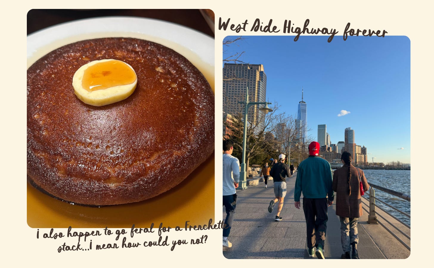 I’d take you to Frenchette for a long lunch with lots of pancakes and French bread and coffee and probably glass of wine. Then we’d walk it all off on the West Side Highway looking over the water! Perfection!