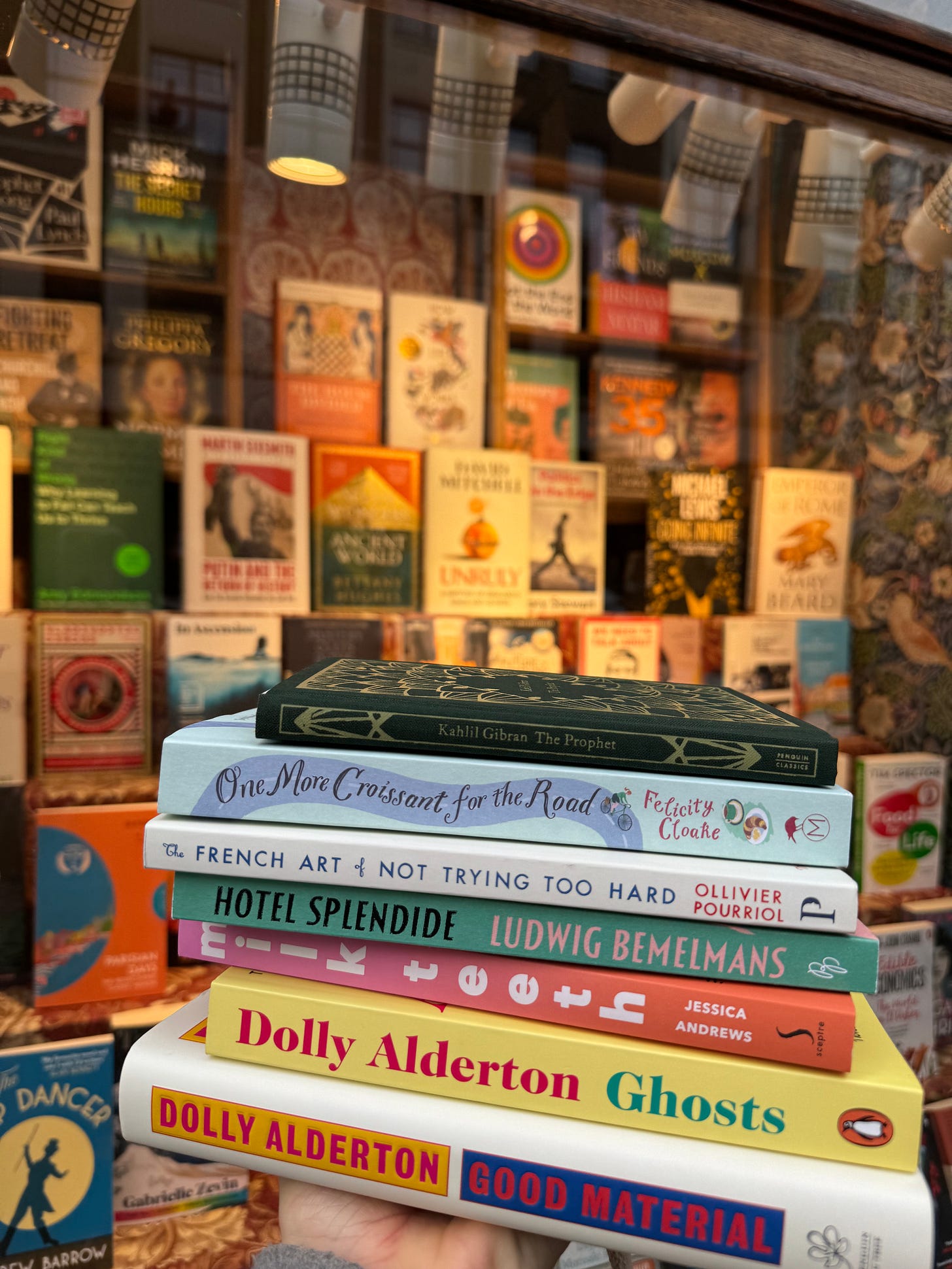 I went in for Dolly Alderton’s latest, GOOD MATERIAL (the most frequently referenced book in recent sunday series Q&As), but walked out with seven titles in total. I also grabbed Dolly’s GHOSTS because it just felt right to lean into this British author’s back titles while in the U.K. then, it was over to other parts of Europe! with a focus on France, I picked up ONE MORE CROISSANT FOR THE ROAD by Felicity Cloake and THE FRENCH ART OF NOT TRYING TOO HARD by Ollivier Pourriol. after spending a fair bit of time in Barcelona throughout and shortly following my college years, the premise of MILK TEETH by Jessica Andrews caught my eye. and in the the New York realm, I stumbled upon HOTEL SPLENDIDE, a memoir by Ludwig Bemelmans (the man behind MADELINE and the wallpaper at The Carlyle!). and for the topper of the stack, my friend Leila gifted me a book of poems she adores, THE PROPHET by Kahlil Gaibran.