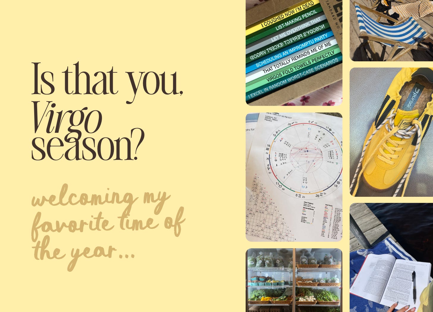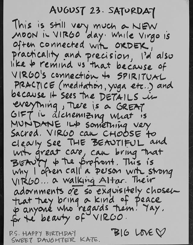 So, as the textbook Virgo I am, today’s edition of The Sunday Series is going to be all about how this astrological season applies to the weeks ahead. Even if you don’t have a single ounce of Virgo in your birth chart (do yours on Co-Star you’re not sure of your sun/rising/moon signs), you’re still swimming in the same cosmic waters. Think of this next month as a collective permission slip to bring a little more order into the chaos—color-coding your calendar, lighting a candle before you open your laptop, finally buying that chic planner that makes you want to sit down and write. Virgo energy is meticulous yet romantic, equal parts practical and poetic. And this month, we all get to lean into that vibe.