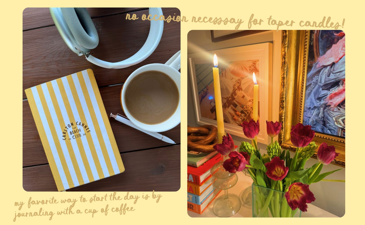 Treat your desk with the reverence of an altar: light a candle before opening your laptop, keep a little dish for paperclips, pens that actually spark joy. In my book, there is no occasion needed for taper candles! Lighting these babies instantly makes an ordinary moment feel special.