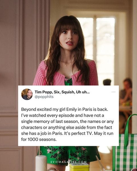 Emily in Paris is so back, baby. obvi I’ve watched all the eps already, and obvi, I forgot what happened entirely last season. irrelevant. the below meme sums it up best. keep the cringe coming, s’il vous plaît!!