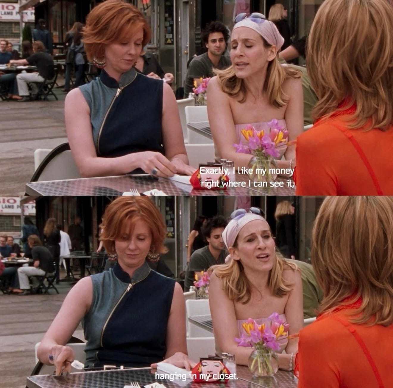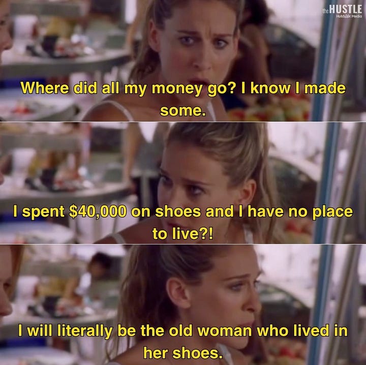 But it’s this inflection point that brings on a whole different slew of emotions (less resentment, more guilt?), including a mix of gratitude, doubt, excitement, fear, and yes, continued lust. The thing is, I don’t want to end up like Carrie!!!! I don’t want to go and try an apartment and realize I could have, if only I didn’t blow it on bags/shoes/that mink coat I [almost] bought in February but resisted.