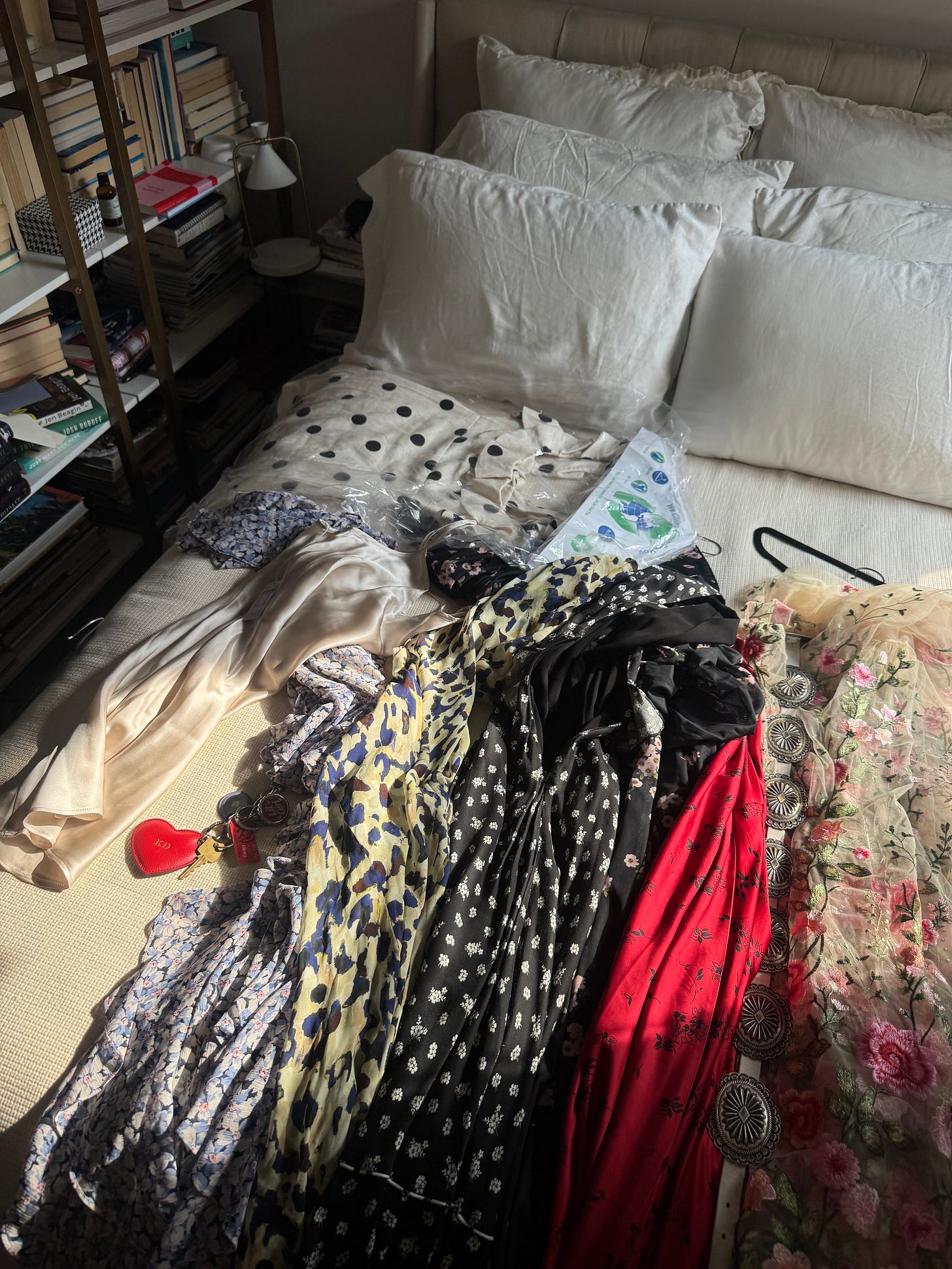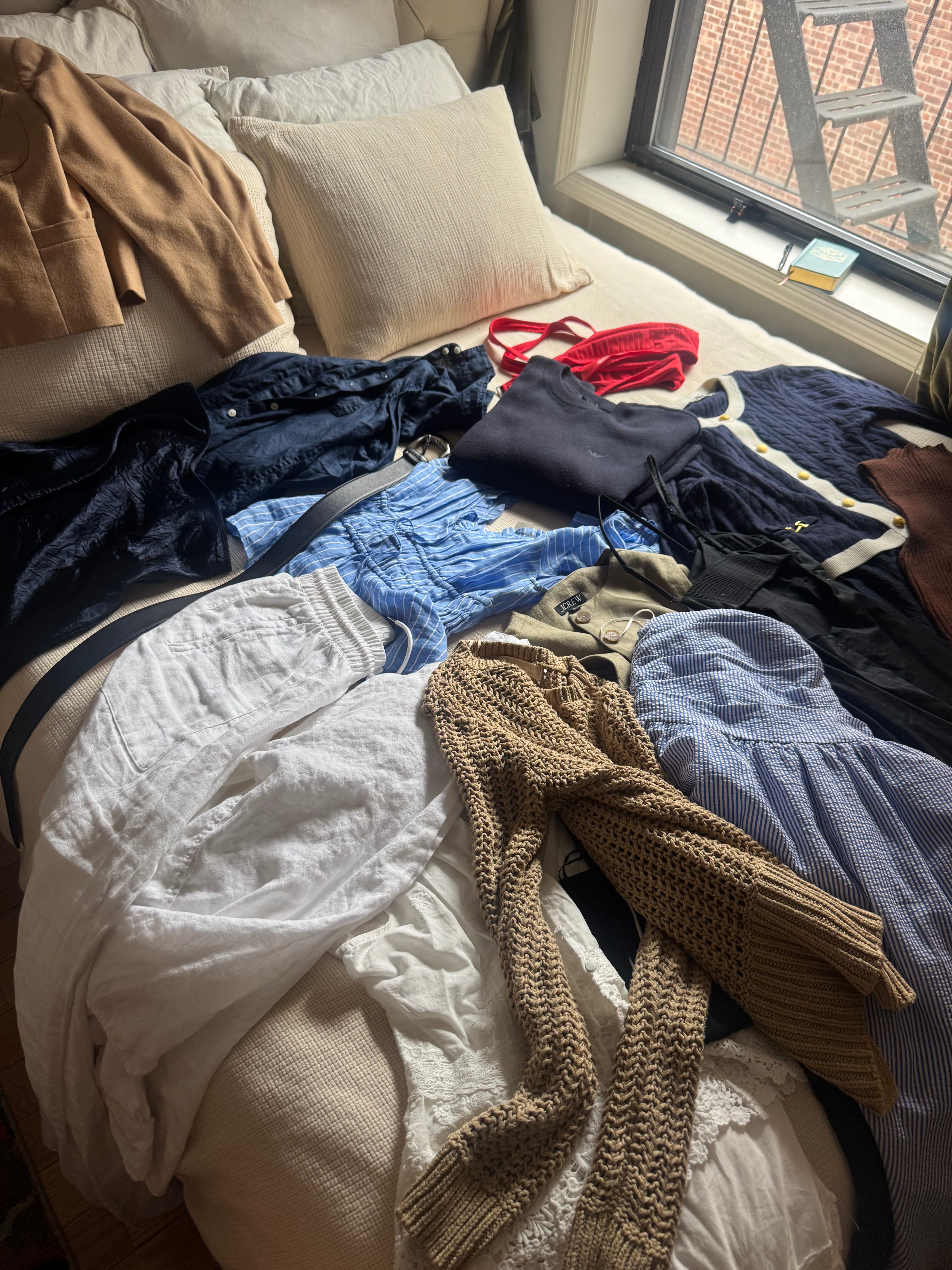 Due to limited space in my apartment, I use my bed for this next step. I pull everything I’m loving at the moment and could envision potentially bringing. This initial pile should be outrageous. Mine always is. But it’ll give you the raw material to cull down and seek clarity later when editing becomes logical instead of emotional.