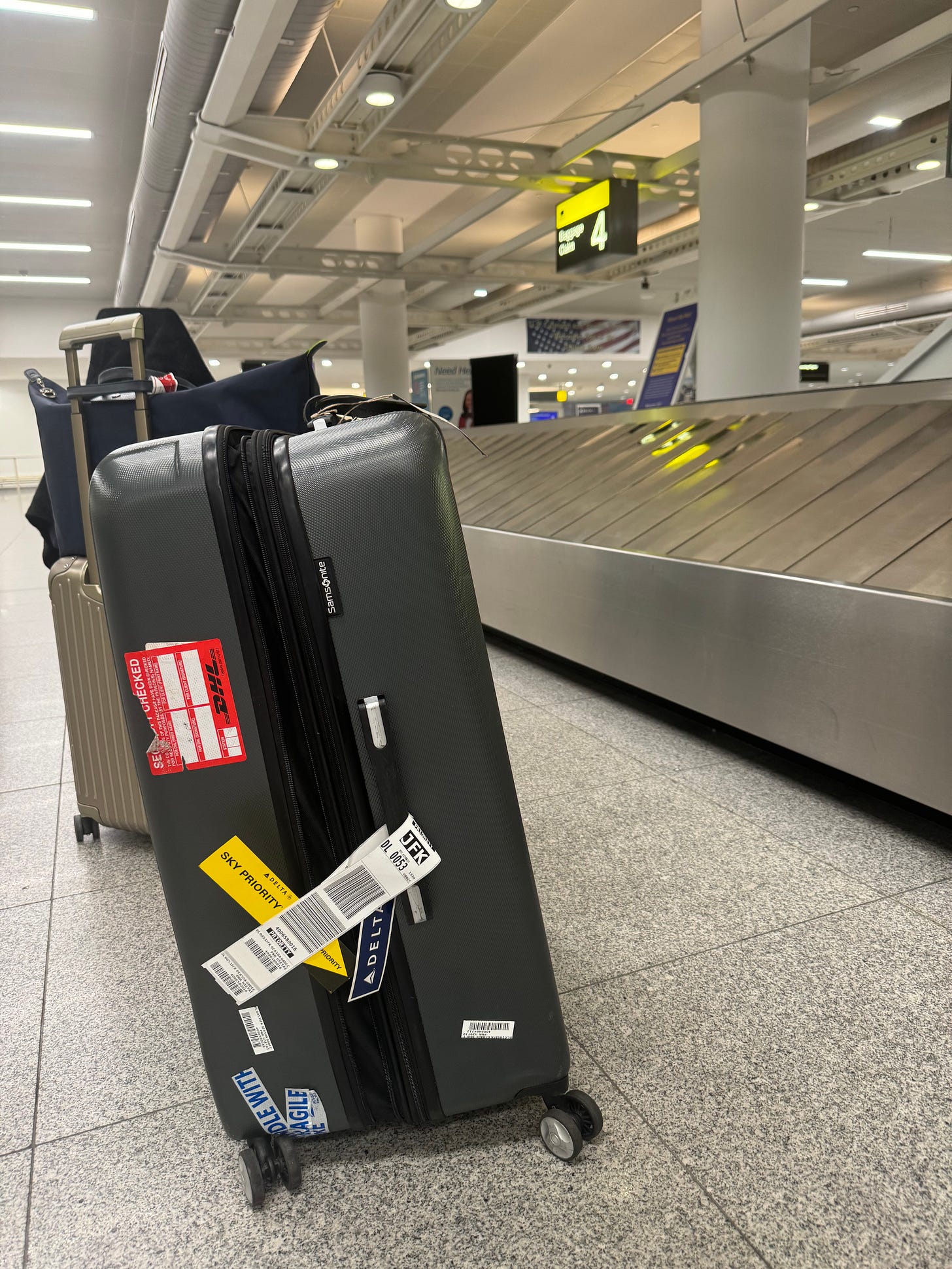 has a checked bag wheel *break* while in the hands of the airline and is then stuck hefting a broken suitcase around (see below)