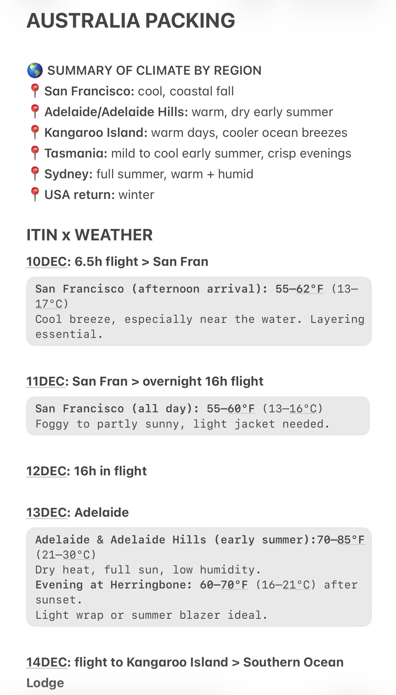 I’m packing for a trip. Here is my itinerary with dates and destinations: [paste itinerary].