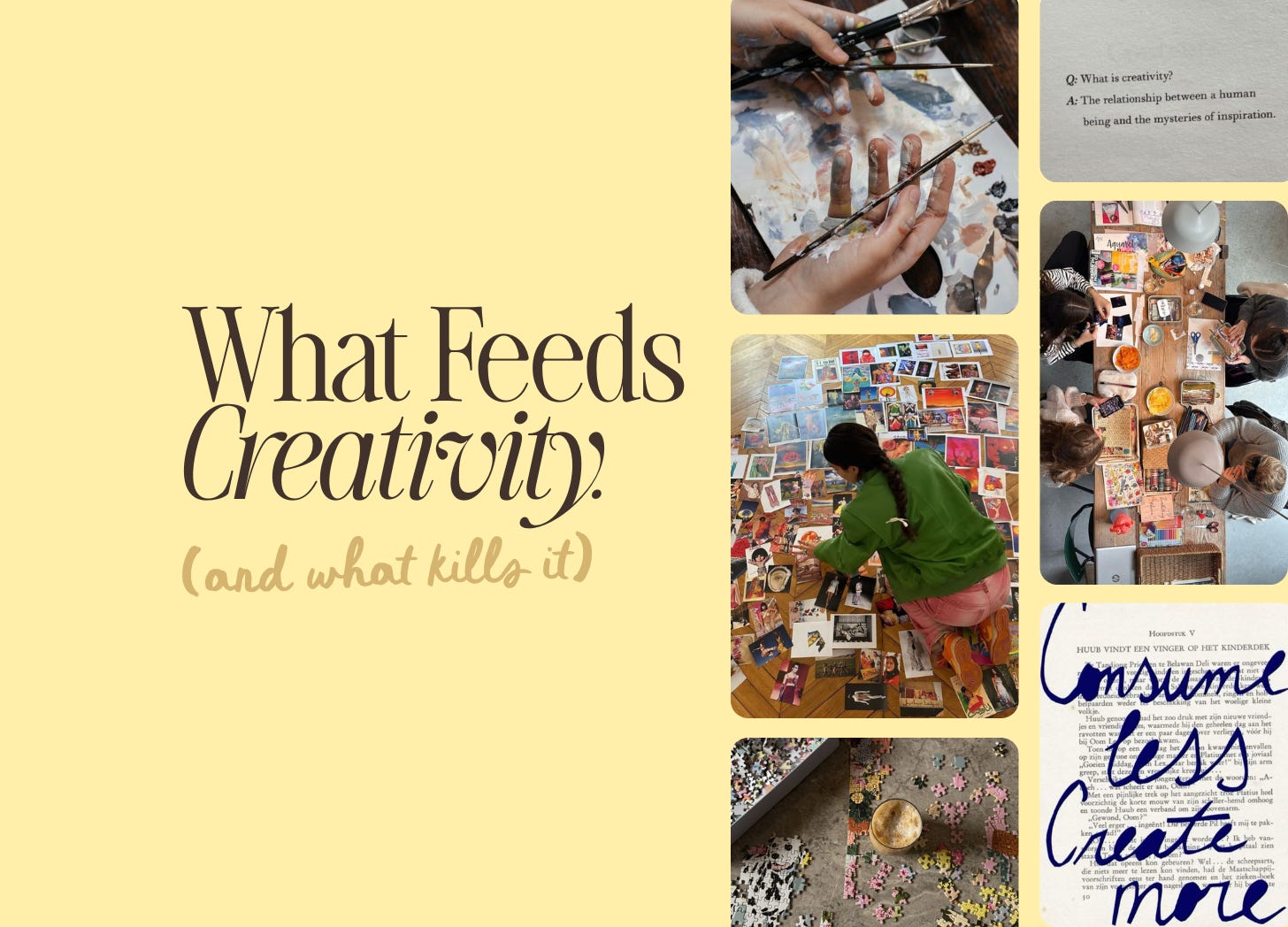 Today’s letter focuses on a topic I ruminate on often: what feeds creativity, and, conversely, what kills it. Each January 1st, I queue up my audiobook of Big Magic: Creative Living Beyond Fear by Elizabeth Gilbert. It’s a quick listen—just about 3.5 hours—and despite this being my fourth time revisiting it, I continue to take away new tidbits.