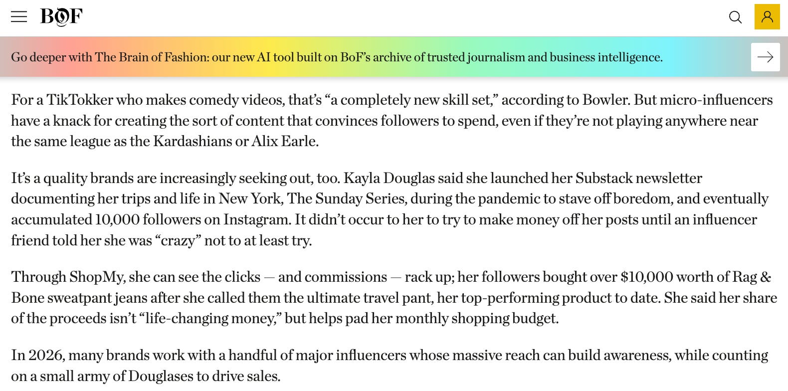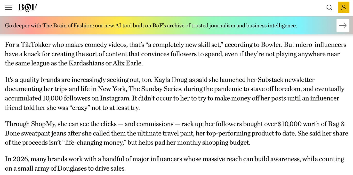 The article, “Not All Creators Convert. Here’s How to Find Those That Do” was reported on by Diana Pearl and was partially a commentary on how more niche audiences like mine convert best! Translation: you all actually shop the links I share (!!!) on my ShopMy. Specifically, it was fun to share how you’ve all bought over $10,000 worth of my favorite rag & bone sweatpant jeans. The article is paywalled, but here’s a snippet in case you want to read.