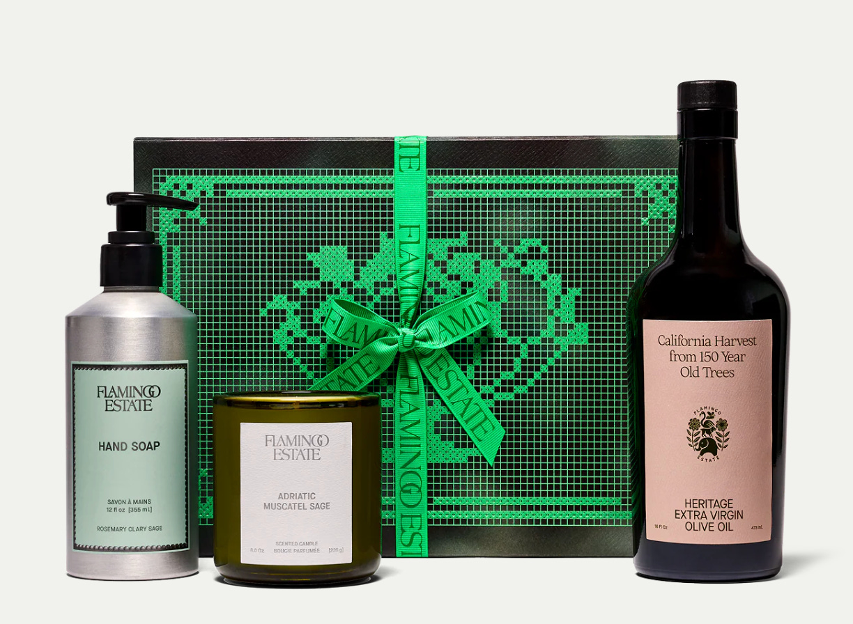 Flamingo Estate Garden Tour Candle, Olive Oil, and Soap Gift Set for a trio that smells like you have a garden in Ojai.