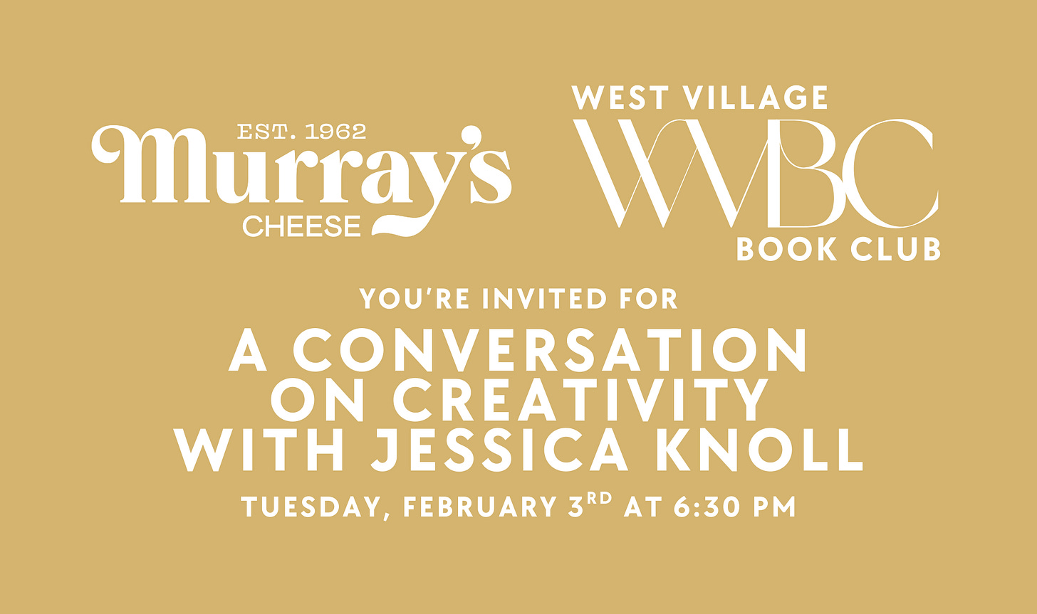 Now, straight into what I’m in your inbox to share! I’m over the moon to be partnering with Murray’s Cheese on this first event in our “Conversations on Creativity,” a quarterly community event where we’ll bring in an author to chat about their work with our West Village Book Club crew. That said, this first one, of course, needs to go well in order for us to keep them going!!!! It would mean the world to me to have you join us. Grab a ticket and invite a friend to come along. There will be wine, cheese, and lots of fun conversation.